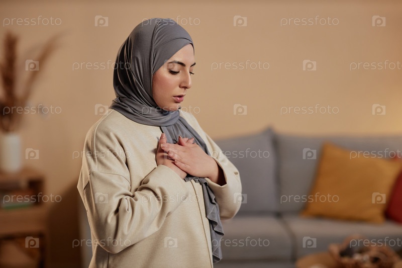 Молодая исламская женщина в хиджабе выражает благодарность своему Богу во время молитвы
