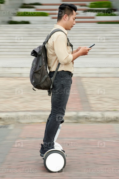 Студент, едущий на электрическом скутере