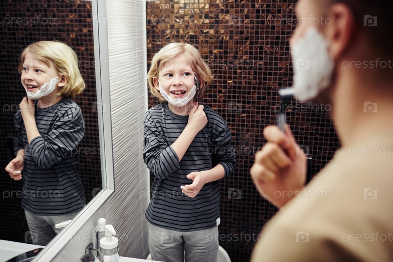 Маленький мальчик брится с отцом