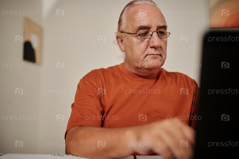 Пожилой мужчина работает на ноутбуке