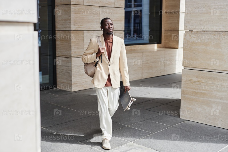 Молодой серьезный бизнесмен в костюме пастельного цвета, несущий скейтборд