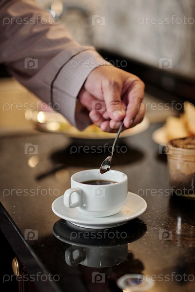 Человек, смешивающий сахар в кофе