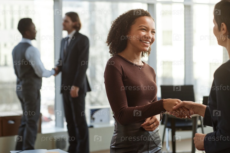Улыбающаяся чернокожая бизнесвуменка обнимает руку с коллегой в офисе