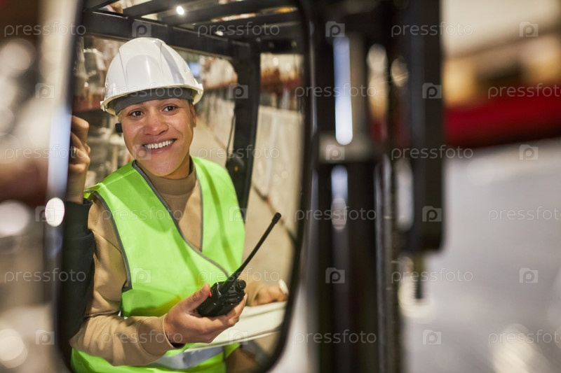 Улыбающаяся молодая женщина управляет вилочным грузовиком на складе