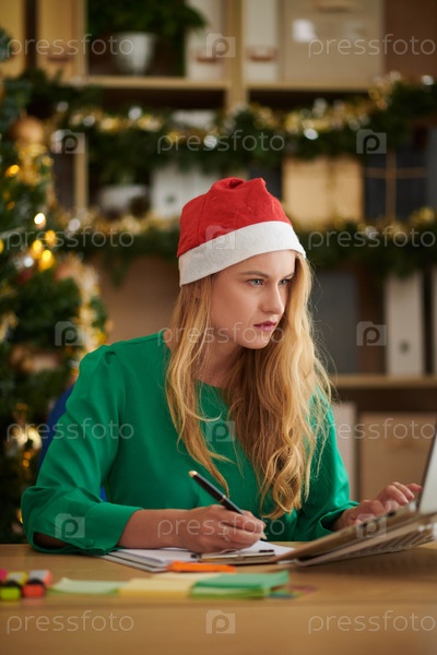 Концентрированная деловая женщина в Санта-Клаусе