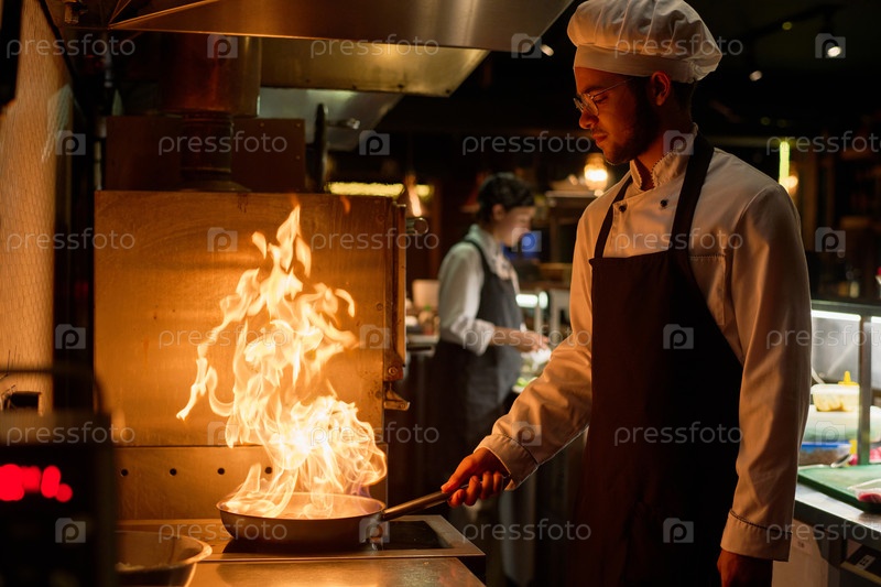 Молодой повар в форме готовит новое блюдо на сковородке с горящим огнем