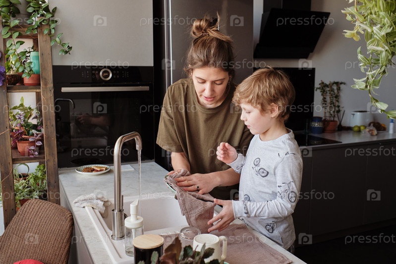 Мать учит сына мыть посуду