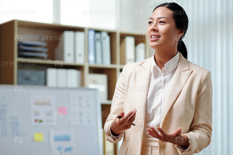 Молодая уверенная брюнетка-бизнесвумен в формальной одежде, выступающая с речью