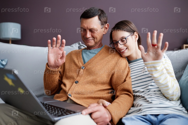 Отец и дочь-подросток машут привет к видеочату, сидя на диване с ноутбуком