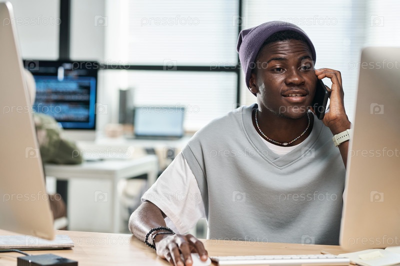 Молодой афроамериканский разработчик программного обеспечения консультирует клиента по мобильному телефону