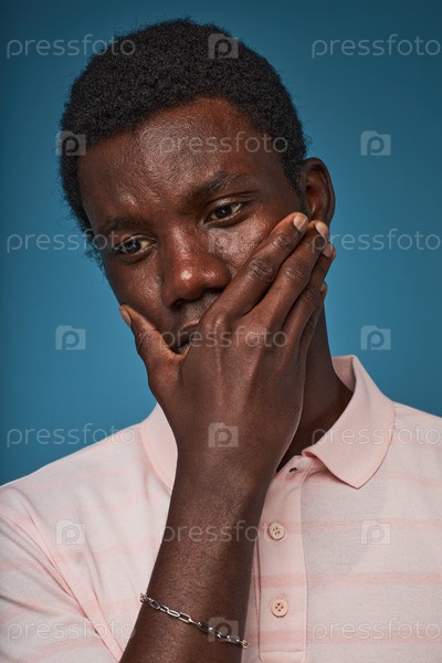 Ближайшее изображение огорченного чернокожего мужчины, закрывающего рот на синем фоне