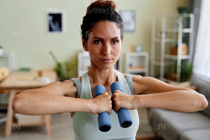 Женщина, держащая гантели во время силовых тренировок дома