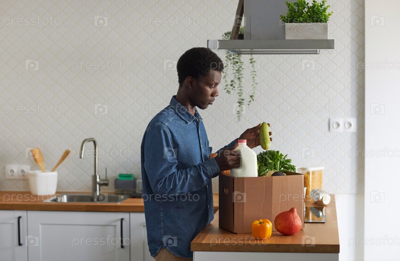 Боковой вид чернокожий мужчина распаковки свежих продуктов питания в минимальной кухне интерьера
