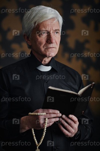 Вертикальный спокойный старший священник, держащий Библию в драматическом освещении