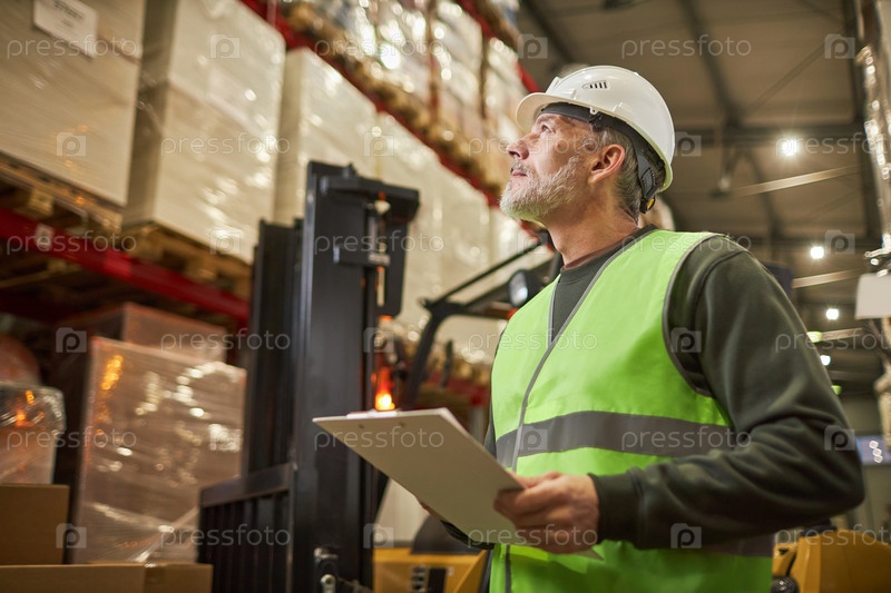 Бородатый работник, держащий клипборд, управляющий складом
