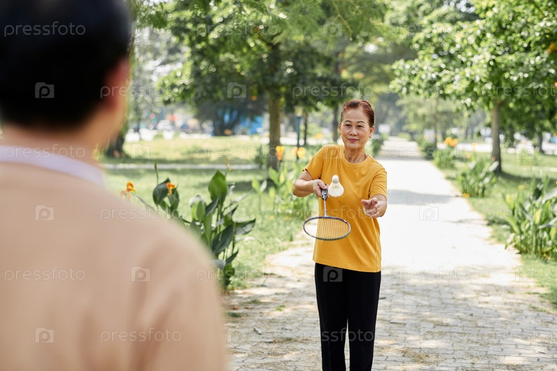 Супружеская пара, играющая в бадминтон Senior