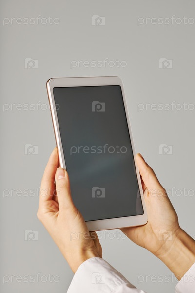 Женская рука держит планшет с пустым экраном на белом фоне