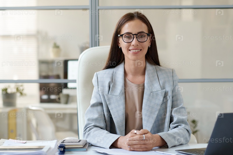 Молодая бизнесвуменка сидит на своем рабочем месте в офисе