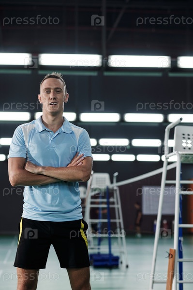 Веселый уверенный игрок в бадминтон
