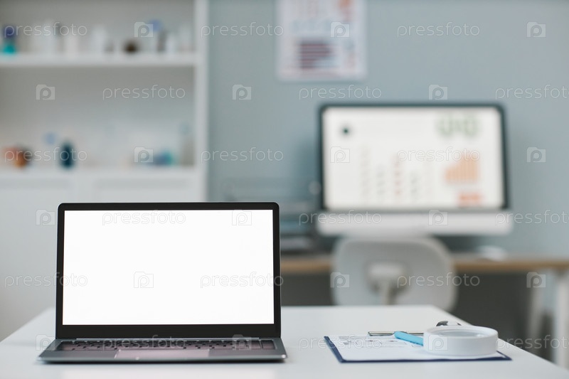 Ноутбук с пустым белым экраном стоит на столе против монитора компьютера