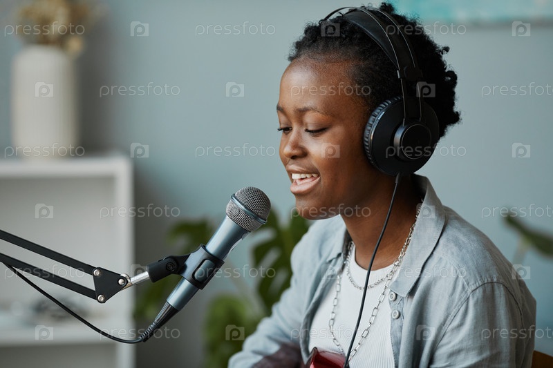 Молодая женщина поет на микрофон в домашней студии