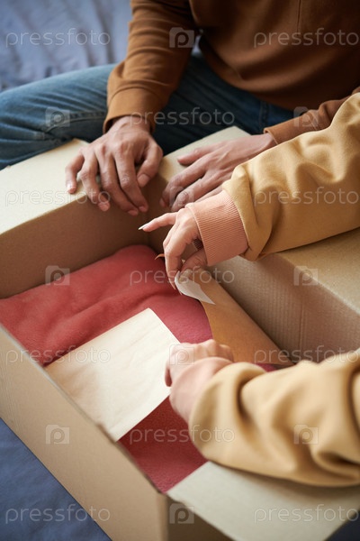 Пара распаковывает посылку новой одеждой