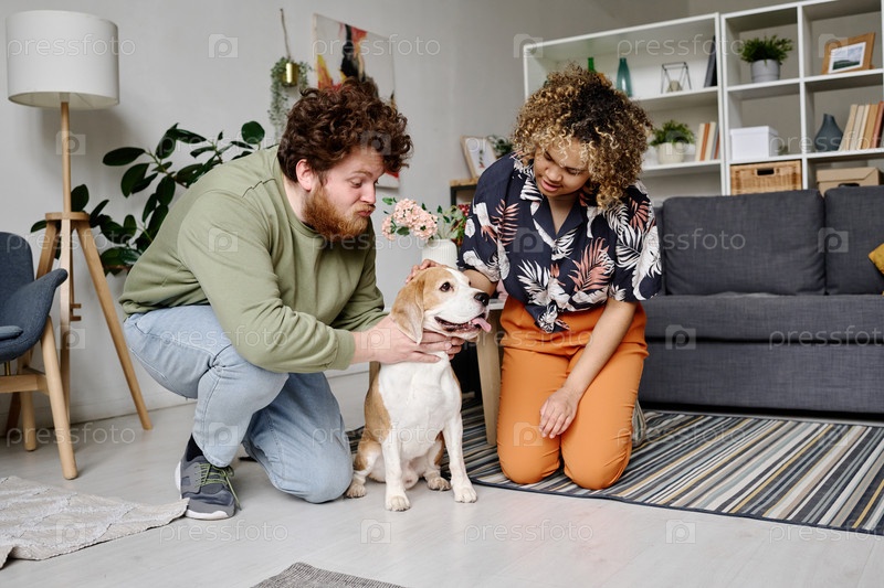 Пара, играющая с собакой дома