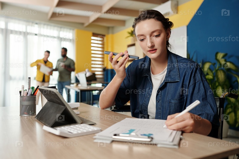 Деловая женщина, слушающая голосовое сообщение