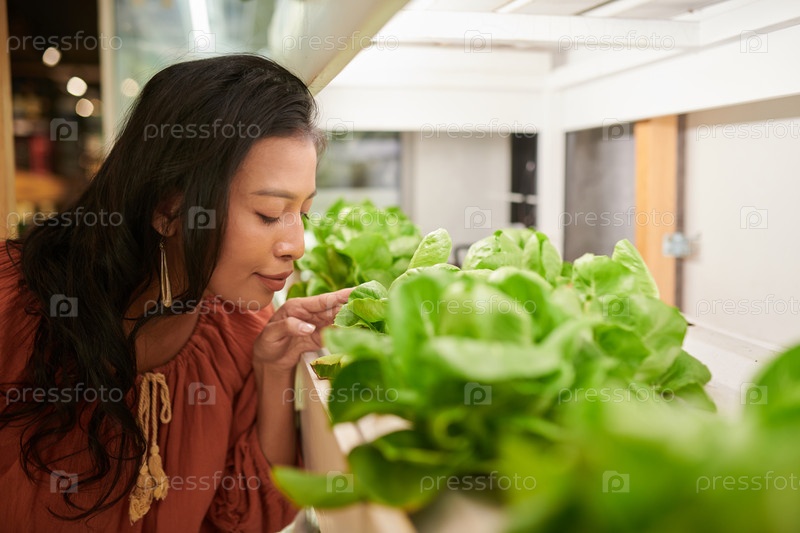 Женщина, нюхающая салат в магазине