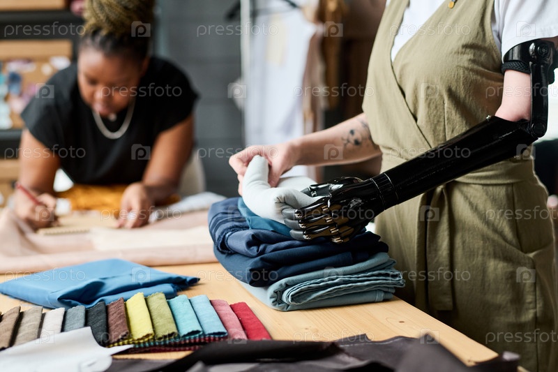 Молодая женщина с миоэлектрическим протезом руки складывает и укладывает текстиль
