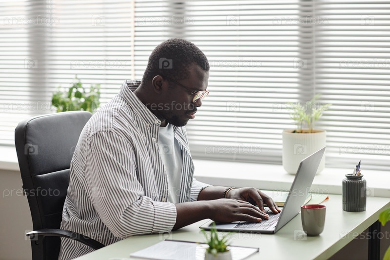 Боковой вид черный бизнесмен, печатающий на клавиатуре ноутбука