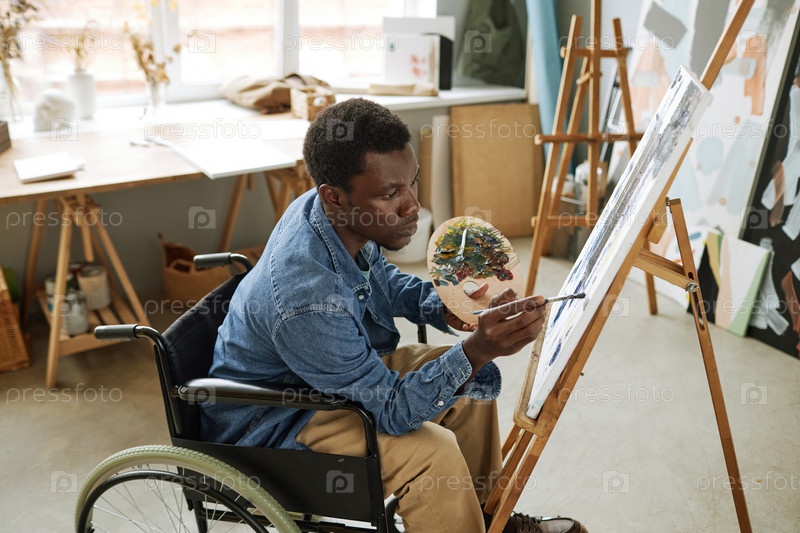 Молодой талантливый чернокожий мужчина с цветовой палитрой рисует новый шедевр