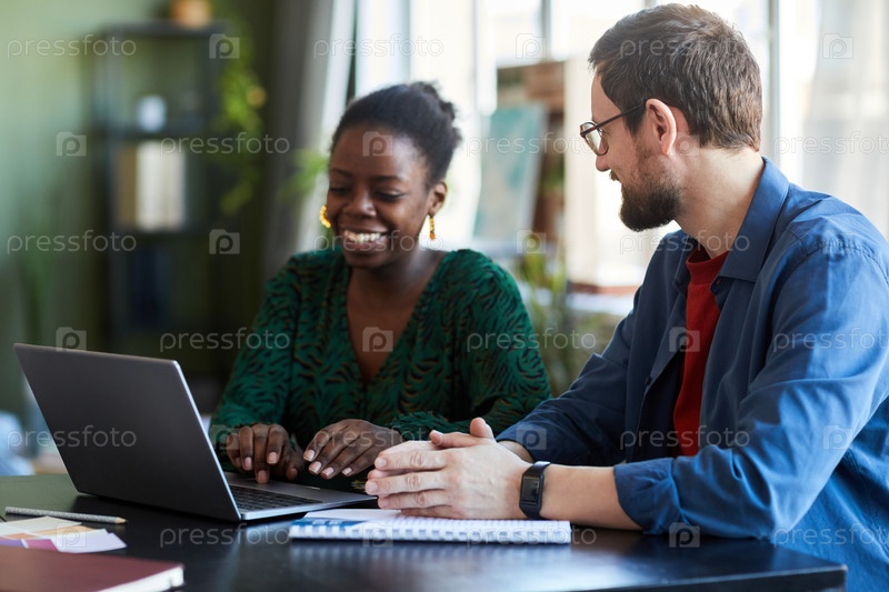 Молодой бизнесмен смотрит на афроамериканскую коллегу на встрече