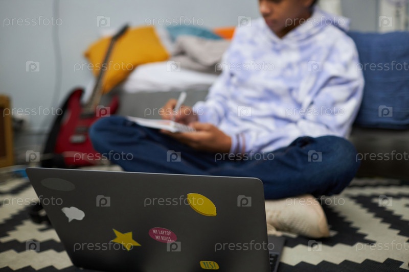 Сосредоточьтесь на обложке ноутбука с группой маленьких стикеров против школьника