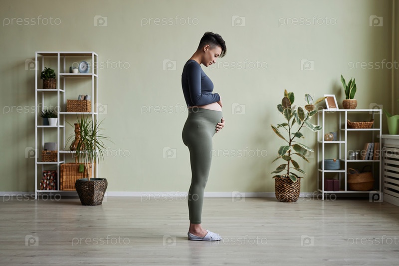 Беременная молодая женщина, одетая в спортивный наряд и держащая живот