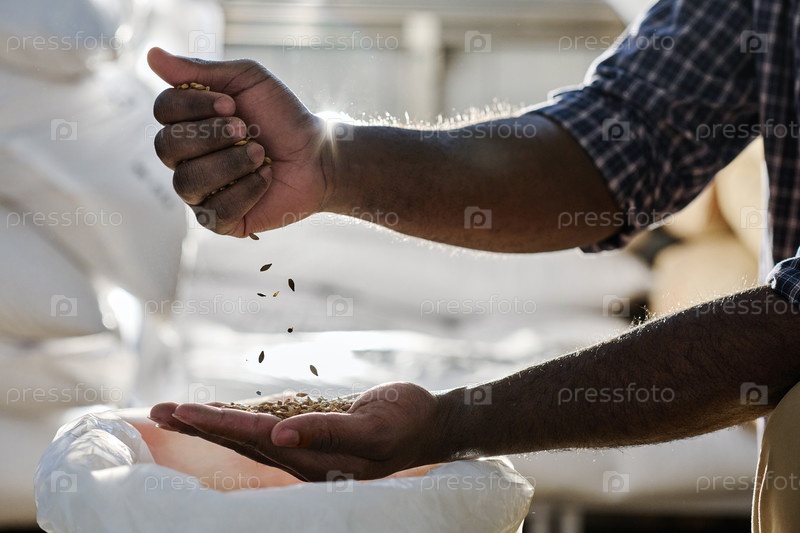 Фермер выбирает хорошие зерновые на ферме