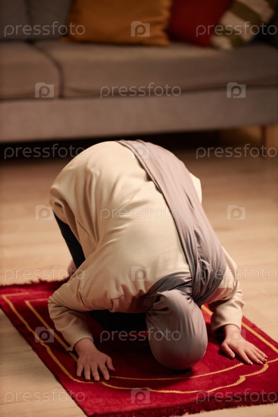 Молодая мусульманка в бежевом пуловере и сером хиджабе молится на красном ковре