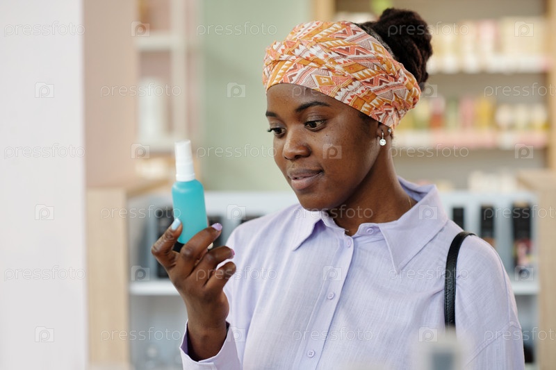 Счастливая молодая черная женщина смотрит на бутылку, содержащую синий жидкий продукт красоты