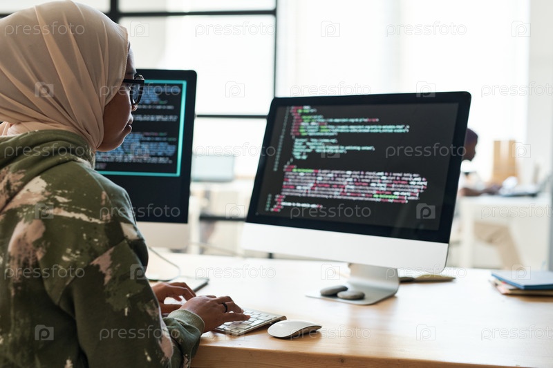 Молодая мусульманская бизнесвуменка смотрит на код на экране компьютера