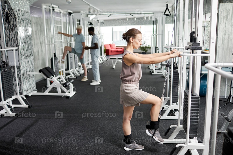 Молодая женщина занимается в реабилитационном тренажерном зале