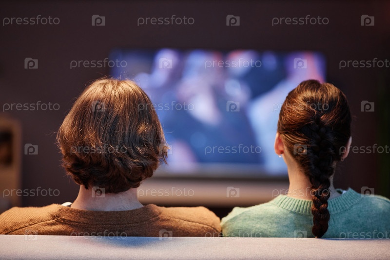 Обратный вид молодой пары, смотрящей телевизор вместе дома