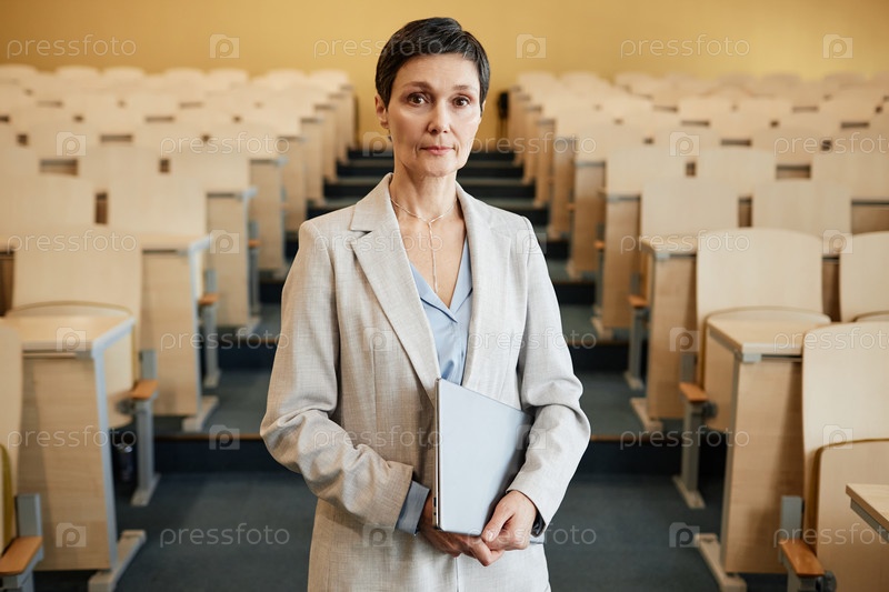 Профессиональный учитель с ноутбуком стоит в лекционном зале