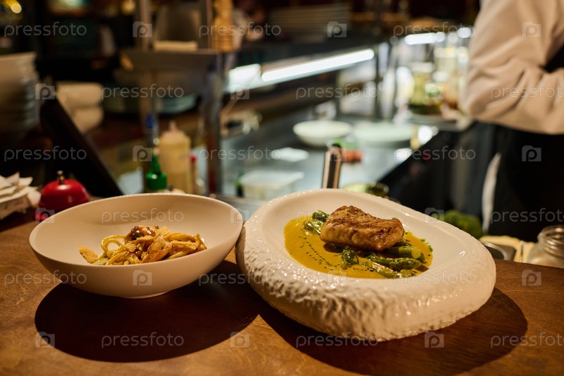 Тарелка с жареным рыбным филе с зелеными бобами и соусом, тарелка с макаронами