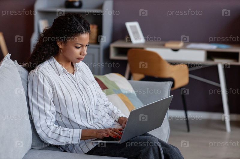 Боковой вид Красивая черная женщина, использующая ноутбук сидит на диване дома