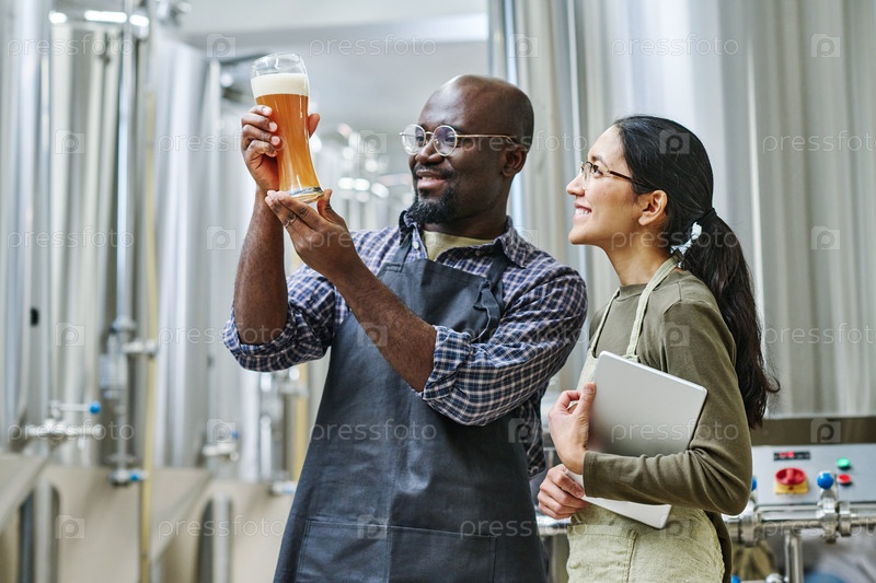 Пара инженеров изучает пиво после приготовления