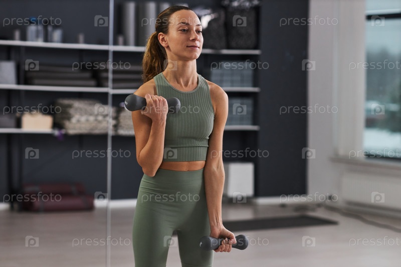 Молодая женщина, занимающаяся гантельками в тренажерном зале