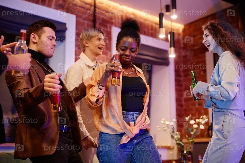 Счастливые молодые активные лесбийские и гей-пары пьют пиво и танцуют