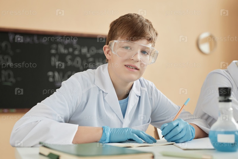 Мальчик-подросток, носящий брекеты на уроках естественных наук в школе, смотрит на камеру