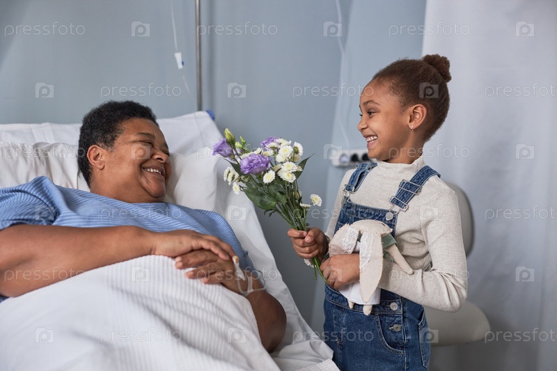 Маленькая девочка навещает бабушку в больничной комнате и держит букет цветов