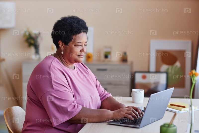 Боковой вид старшей афроамериканской бизнес-жены, печатающей на клавиатуре ноутбука
